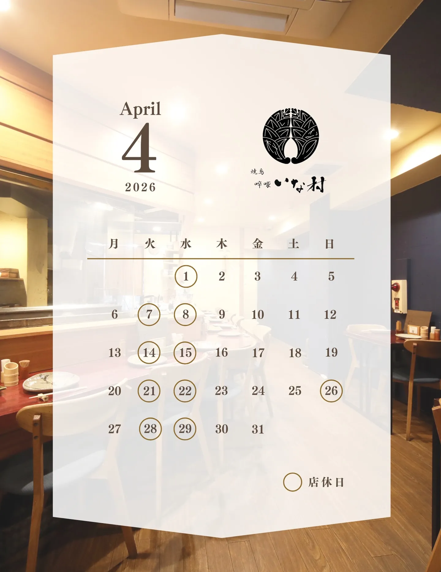 4月は毎週火曜日と水曜日、26(日)を店休日とさせていただきます。